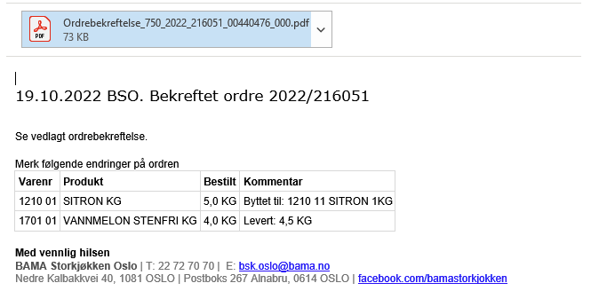 Selve ordrebekreftelsen ligger som vedlegg i denne e-posten, der fremkommer eventuelle endringer tydelig ved at varelinjen er markert.